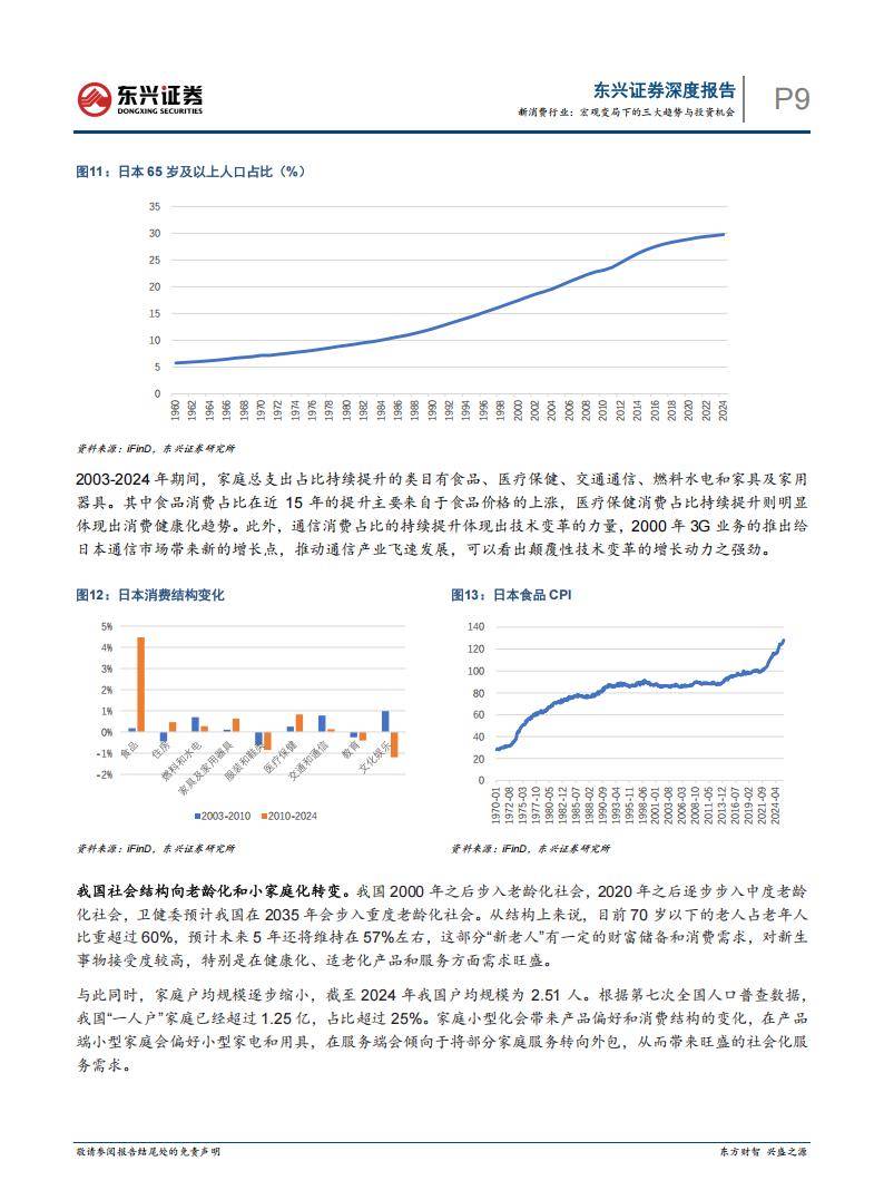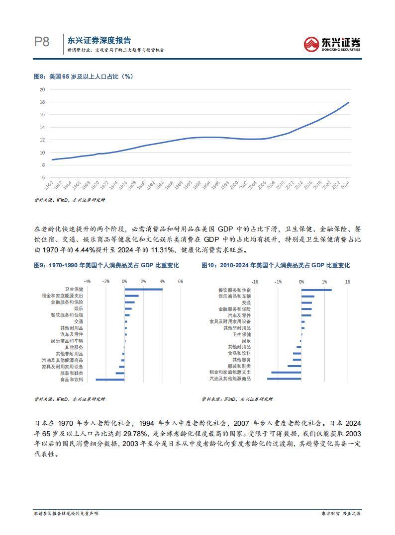 美国1970-1990年和2010-2024年,65岁及以上人口占比持续提升,必需消费品与耐用品占GDP比重下滑,卫生保健、金融保险、交通、餐饮住宿等健康相关和服务相关消费占比明显增加。其中卫生保健消费占比由4.44%提升到11.31%。日本进入重度老龄化后,2003-2024年家庭总支出占比持续提升的主要类别包括食品、医疗保健、交通通信、燃料水电和家用器具。
