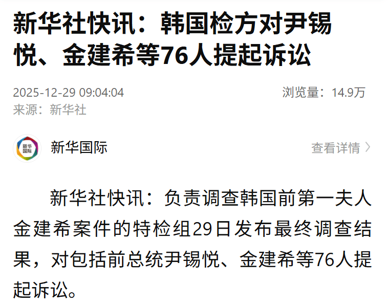 新华社快讯:负责调查韩国前第一夫人金建希案件的特检组29日发布最终调查结果,对包括前总统尹锡悦、金建希等76人提起诉讼。