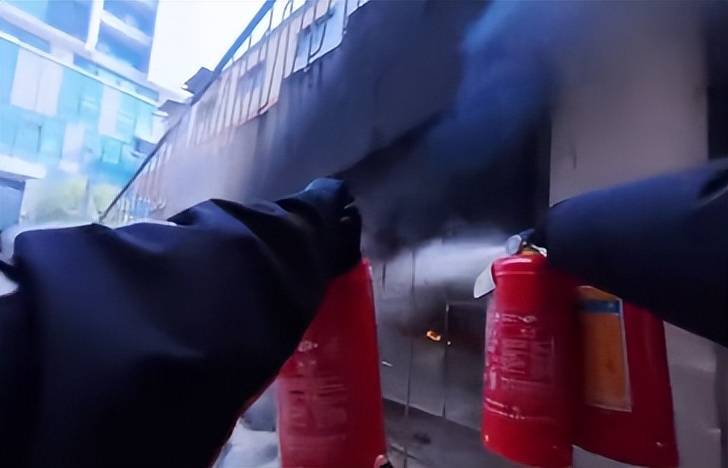 第一个冲上去救火的是一位身穿黑色羽绒服的大哥。从他的穿着和行动方式来看,大概率是跑众包的外卖员。他深知时间就是生命,火势每蔓延一秒就会给居民带来更大的危险。于是他快速地在周围寻找灭火工具,很快就找来了很多灭火器。他双手熟练地操作着灭火器,就像电影里的“双枪李向阳”一样,一手提溜着两个灭火器,毫不犹豫地对着火源喷射。白色的灭火泡沫如同一股强大的力量,向着熊熊大火扑去,试图压制住那肆虐的火势。