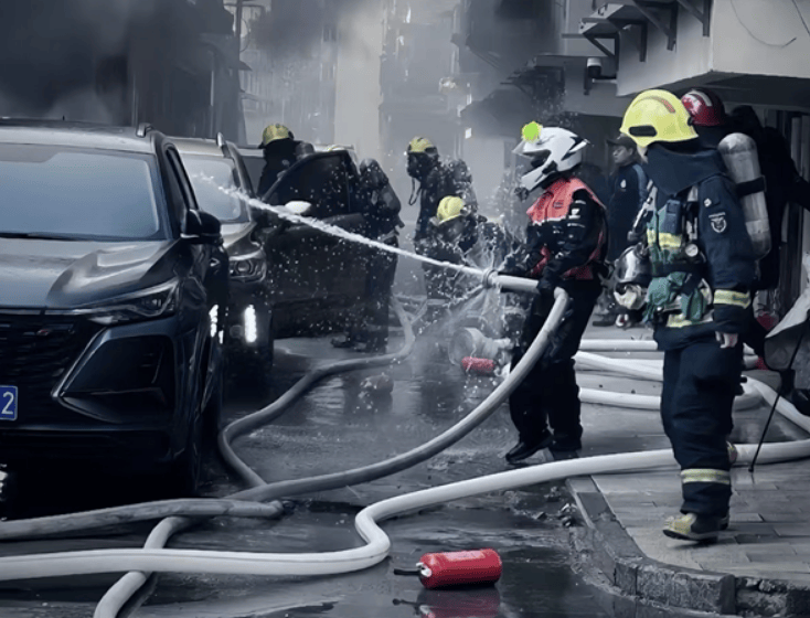 就在身穿黑色羽绒服的大哥奋力灭火的时候,另一位外卖员也加入了战斗。这位外卖员是淘宝闪购的小哥,他原本可能是在送外卖的路上,看到这里起火便毫不犹豫地停下了脚步。他观察了一下火势,发现灭火器虽然起到了一定的作用,但对于如此凶猛的大火来说还是有些力不从心。于是他当机立断,及时接过了保安递来的消防栓水枪。他的动作娴熟而专业,在不到两分钟的时间里,就成功地将火情扑灭了。熊熊大火在他的努力下逐渐熄灭,只剩下一些还在冒烟的残骸,仿佛在诉说着刚刚那场惊心动魄的战斗。