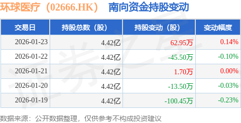 证券之星消息,1月23日南向资金增持62.95万股环球医疗(02666.HK)。近5个交易日中,获南向资金减持的有3天,累计净减持94.8万股。近20个交易日中,获南向资金减持的有12天,累计净减持1159.0万股。截至目前,南向资金持有环球医疗(02666.HK)4.42亿股,占公司已发行普通股的21.95%。