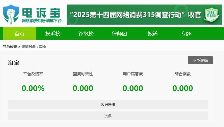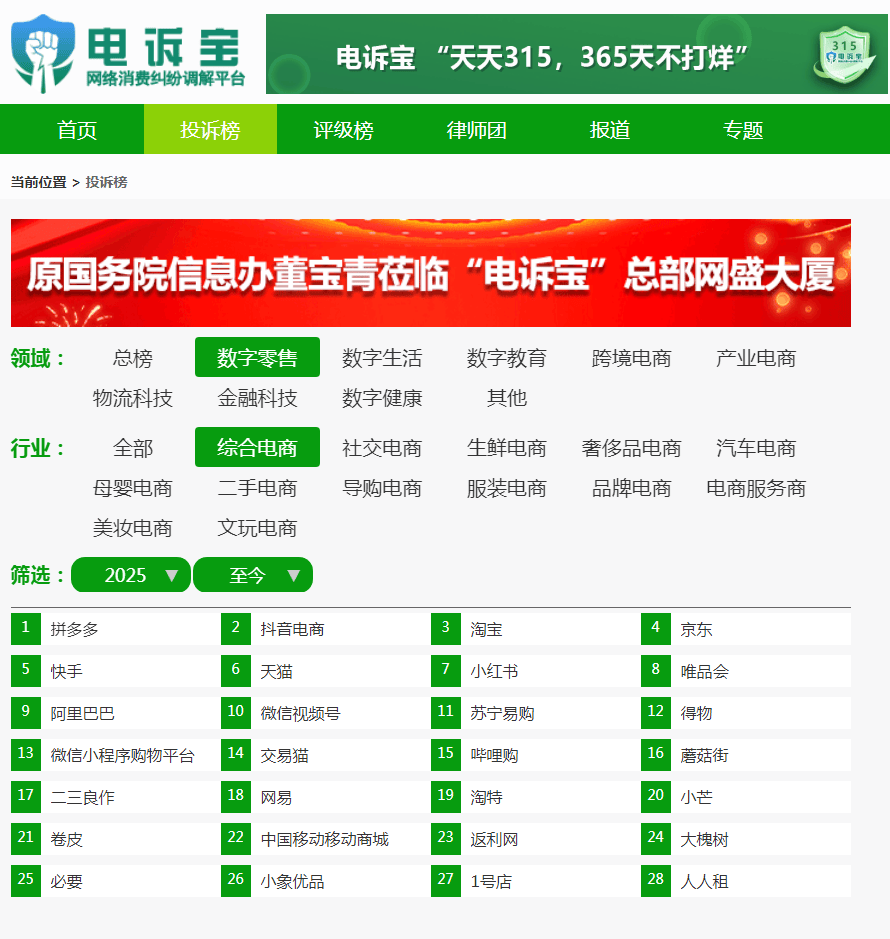 根据“电诉宝”2025年至今受理的综合电商领域用户有效投诉显示(依据投诉量排行),淘宝排第三名。其他被投诉的类似平台依次有:拼多多、抖音电商、京东、快手、天猫、小红书、唯品会、阿里巴巴、微信视频号、苏宁易购、得物、微信小程序购物平台、交易猫、哔哩购、蘑菇街、二三良作、网易、淘特、小芒、卷皮、中国移动商城、返利网、大槐树、必要、小象优品、1号店、人人租。