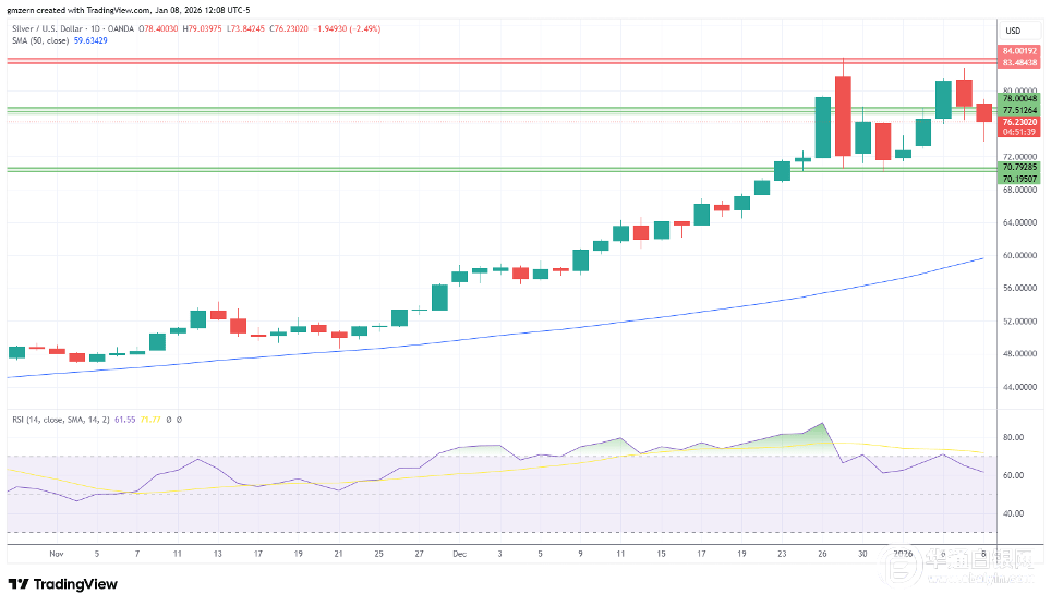 跌破74.00美元将为白银测试下一个支撑位70.20-70.80美元开辟道路。