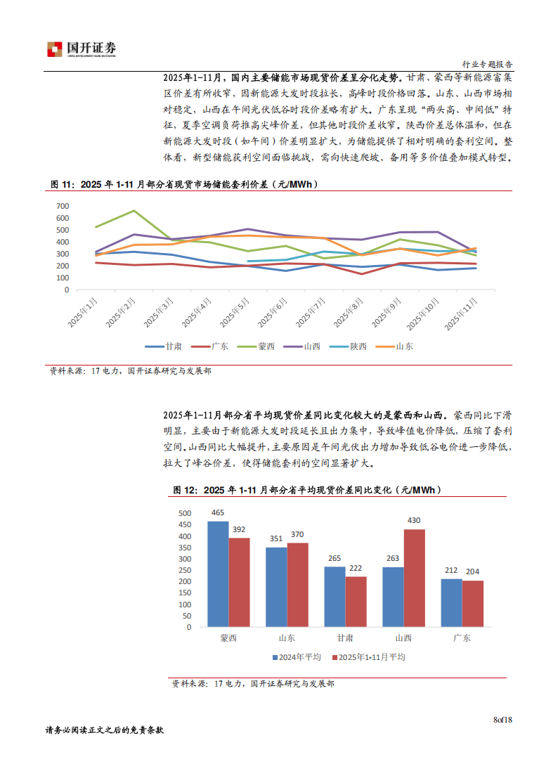 独立储能作为独立的市场投资主体,盈利模式日益丰富,形成了容量价值收益、辅助服务收益、电能量市场收益构成的“基础+稳定+增量”收益组合。容量收益提供保底收入,辅助服务收益相对稳定且存在技术溢价,电能量市场收益则具有高波动与高潜力特征。2025年1-11月,国内主要储能市场现货价差呈现分化走势,甘肃、蒙西等新能源富集区价差收窄,山东、山西市场相对稳定,广东呈现“两头高、中间低”特征,陕西在新能源大发时段价差明显扩大,为储能套利提供了空间。各地也出台了差异化的容量补偿政策,推动独立储能市场化、规范化发展。