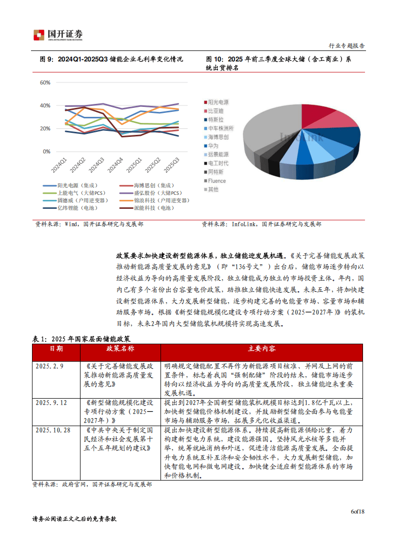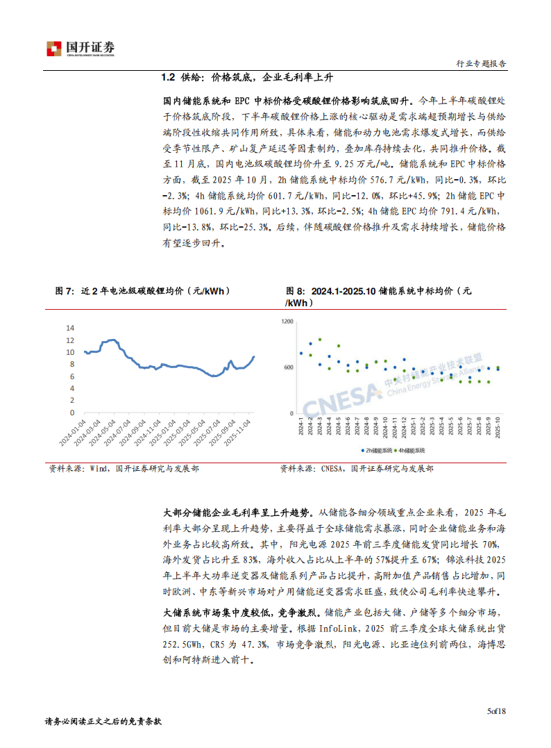 从行业供需来看,2025年1-10月中国新型储能新增装机规模达35.8GW,同比增长36%,预计到2030年,保守场景下累计装机规模将达236.1GW,理想场景超291GW,未来五年复合增速超20%。在供给端,受碳酸锂价格波动影响,国内储能系统和EPC中标价格筑底回升,截至2025年10月,2h储能系统中标均价576.7元/kWh,4h储能系统均价601.7元/kWh。随着需求增长与成本推动,大部分储能企业毛利率呈上升趋势,头部企业在技术、资源等方面优势显著,行业集中度有望进一步提升。
