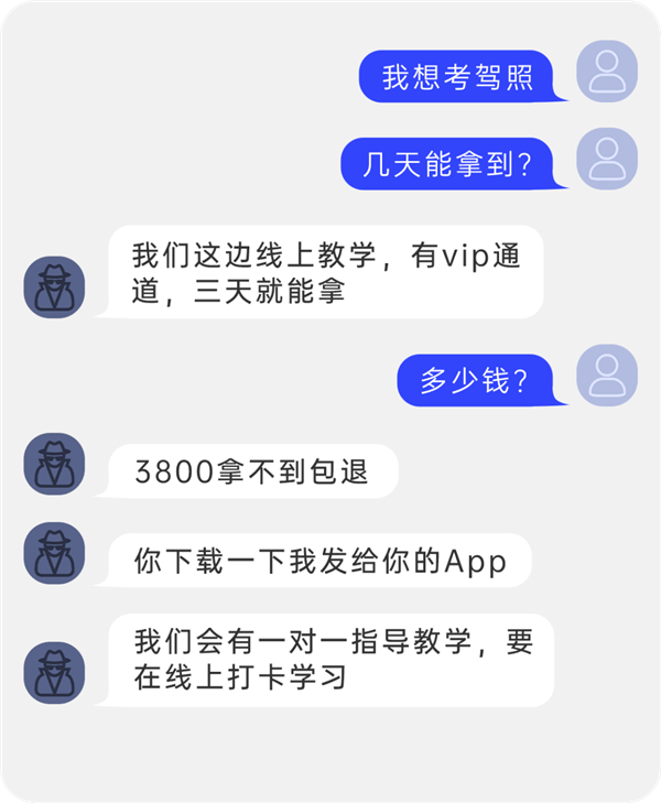 骗子通过短视频或评论区等社交场景发布虚假广告,以“不用练车,不用考试,快速拿驾照”“线上三天免考拿驾照”等极具诱惑力的话术吸引目标用户。