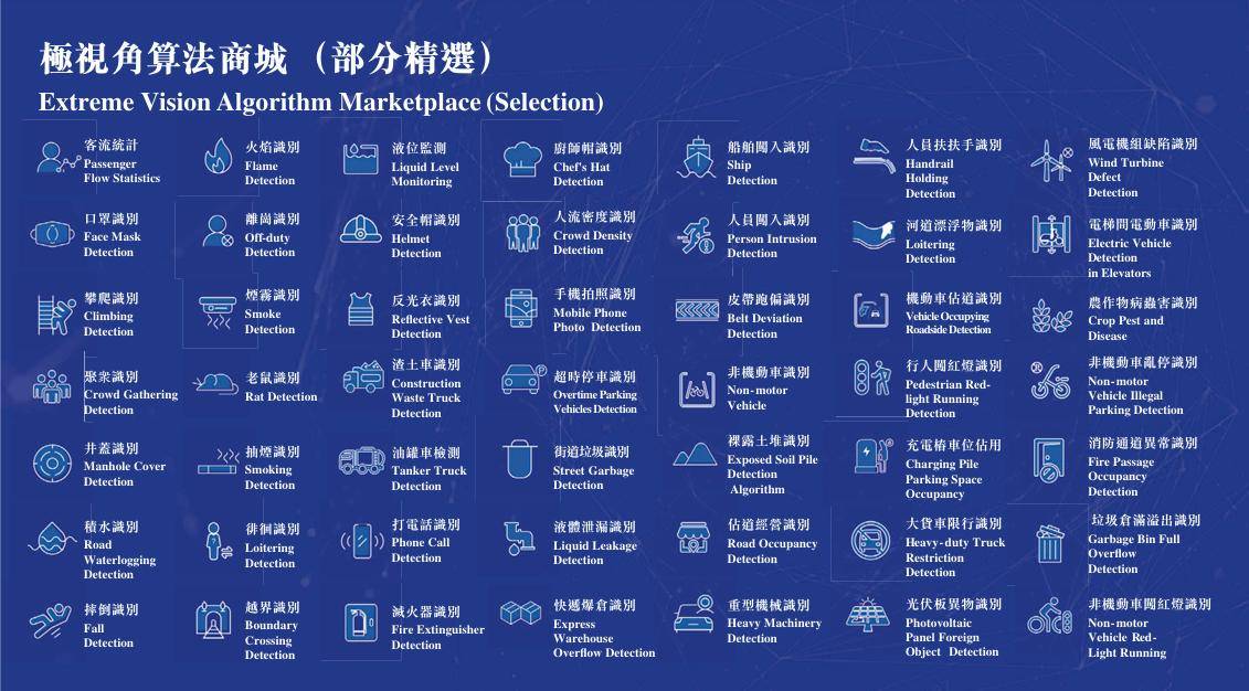 在上述两项核心技术引擎的共同驱动下,极视角得以通过“极星”“极栈”两大交付平台向用户提供方案。其中,极星定位AI算法推理及部署平台,内置算法商城,汇集多种AI视觉算法,能够协助企业建构并部署AI解决方案。