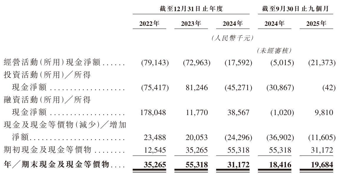 而目前,极视角的经营活动现金流就已处于流出状态,报告期内分别为-7914.3万元、-7296.3万元、-1759.2万元和-2137.3万元,截至2025年9月末该公司在手现金及现金等价物仅剩1968.4万元,较2024年末减少近1150万元。