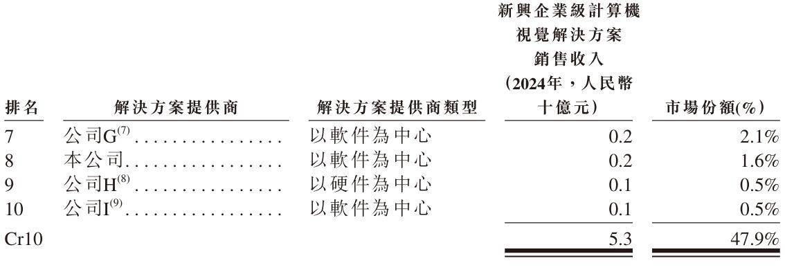 弗若斯特沙利文报告显示,按2024年的收入计算,极视角在中国新兴企业级计算机视觉解决方案市场中排名第八,市场份额为1.6%;同时该公司也是中国新兴企业级计算机视觉解决方案市场中第三大以软件为中心的提供商。