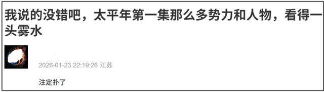 历史题材大剧《太平年》终于播出了!作为央视一台选择的开年大剧,该剧从定档到播出都备受关注,电视台和网播平台都对其寄予厚望。可惜,作品播出之后的收视成绩、网播成绩和口碑都不甚理想,最终很可能逃不开低开扑走的结局。