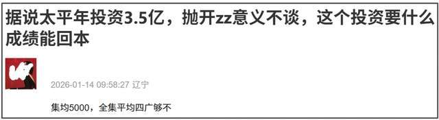 据爆料,《太平年》作为一部历史题材大剧,投资高达3.5亿。从剧中恢宏的场面,精致的服化道,以及处处考究的细节不难看出该剧制作成本不低。成本高也就意味着回本难,以《太平年》目前的播出成绩和口碑反馈来看,回本更是难上加难了。