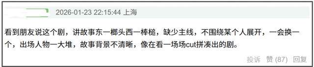 除此之外,导演的水平也不行,讲故事东一榔头,西一棒槌的,完全没有逻辑。故事并不围绕着某个人或某个势力展开,而是一会儿换一个人物,出场人物一大堆,故事脉络却始终不清晰,像是一场场cut拼凑出来的剧,节奏问题很大。