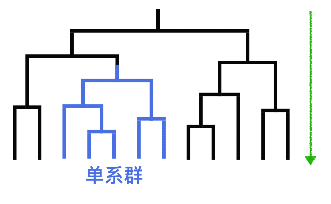 什么叫做完整的分支呢?就是像图中这样,我们用一把剪刀可以一下就从树上把这个分支剪下来,这样一个类群,我们就把它叫做单系类群。一个单系类群里的所有物种,都具有相近的亲缘关系,并且具有相近亲缘关系的所有物种都被包含在这个单系群里面。