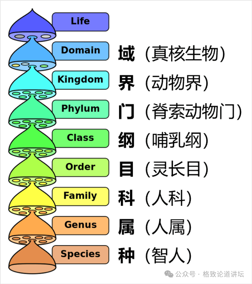 我们知道,分类学是按照域、界、门、纲、目、科、属、种这样几个分类阶元,把物种分成不同的类别。我们可以想象,如果同样的一个类别当中的物种,它们的演化关系也是更近的,我们就说分类学和演化历史是相一致的。