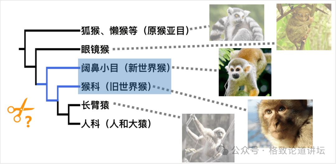 通常,我们会称为猴子的、比较熟悉的猴子包含两类:一类是分布在美洲的新世界猴,另一类是分布在旧大陆的旧世界猴。那么,这两类物种——大家可以看到,在系统发育树上并不能用剪刀一下剪下来,我们至少要剪两下。那么,这种至少要剪两下,但又是同一个分支的,我们把它叫做并系类群。