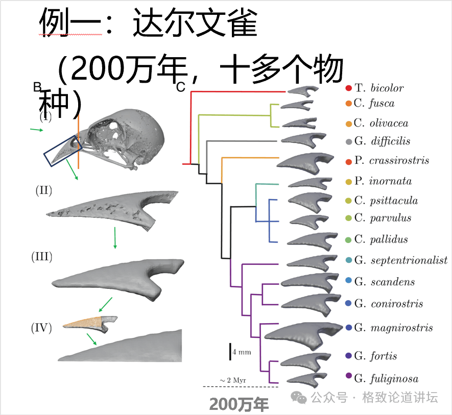 首先,大家可能都非常关注,为什么不同的生物会长得多种多样?这里我们举一个达尔文雀的例子: