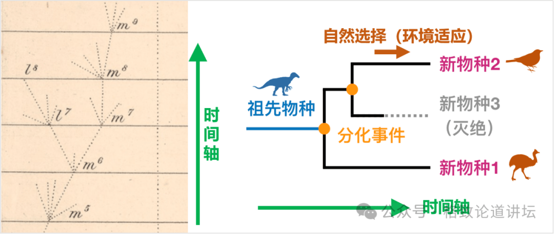 系统发育树是演化研究里非常重要的一个概念,因为几乎所有的演化事件都发生在这样一棵树上。在达尔文的这棵树上,时间是由下向上流逝的,像左边这张图一样。