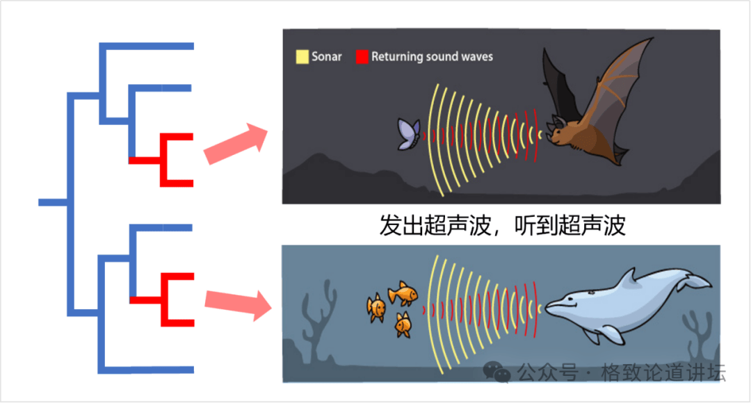 这里我再举一个同样是趋同演化的例子。大家知道,蝙蝠和齿鲸都具有回声定位能力,它们能向前发出超声波,然后通过听到环境返回的超声波,从而判断前方是不是有障碍物,或者是不是有猎物。