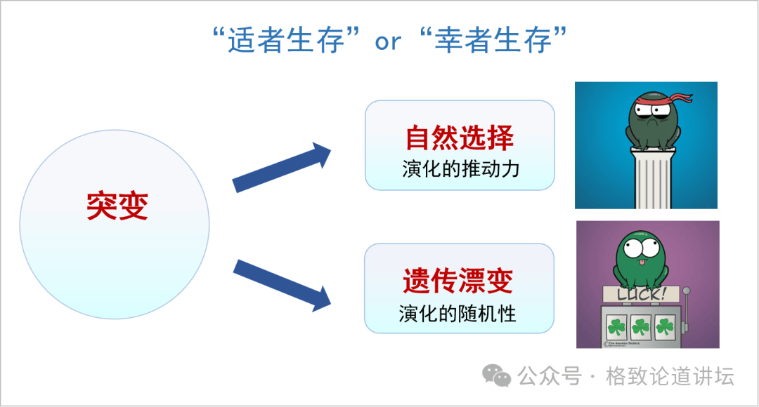 现在,我们有了自然选择和遗传漂变这样两个因素。大家可能会好奇,谁在演化当中会占据上风,是更主导的作用呢?这个问题的答案,其实在我们研究者当中也有一个演变的历史。