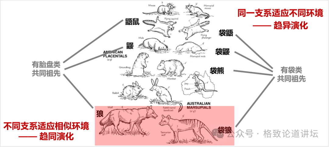我们把澳洲的有袋类和北美洲的有胎盘类哺乳动物进行对比,会发现这两个不同的演化支系当中,有一些物种在适应相似的环境的时候,会发生趋同演化。比如说,我们非常熟悉的狼和有袋类的袋狼,它们都是各自生活环境当中的顶级捕食者,都是吃肉的,所以它们的体型也会长得非常相似。