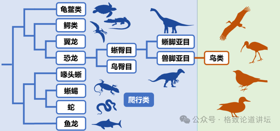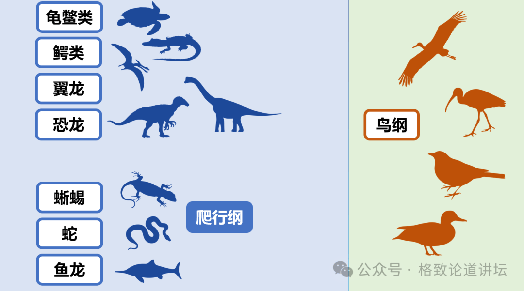 另外一个更有意思的例子,就是爬行类和鸟类。在传统的分类学当中,这是两个平行的纲,我们把它叫做爬行纲和鸟纲。我们知道,爬行类其中包含很多类别,包括我们熟悉的龟鳖类、鳄鱼、蜥蜴和蛇等等,也包括小朋友们都很喜欢的翼龙、恐龙和鱼龙这样一些史前生物。