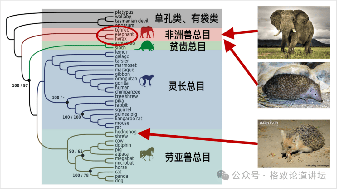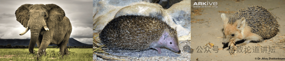 既然如此,我请大家来猜一下图中展示的三个物种——非洲草原象、马岛猬、大耳猬,这三个物种哪两个物种是近亲,或者哪两个物种的亲缘关系更近呢?