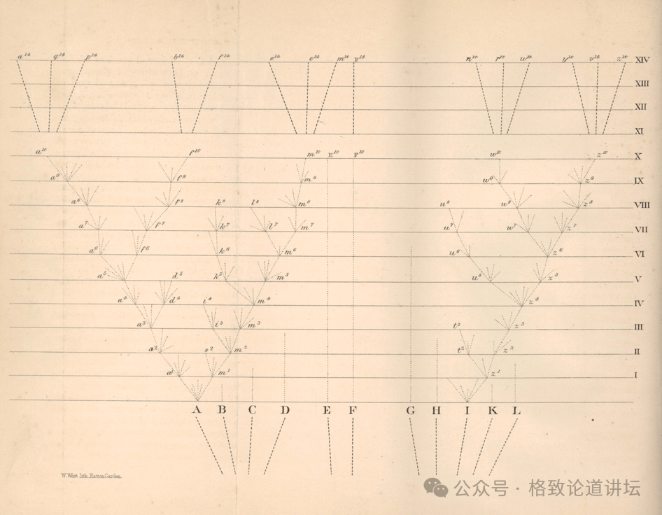 所以说,达尔文对于演化理论的核心贡献其实有两条:首先是他提出了所有的物种都有一个共同的祖先,并且所有的物种是沿着一个树状的演化关系,从这个共同祖先分化出来的;其次才是他的自然选择理论,来表明自然选择是演化过程当中的推动力。