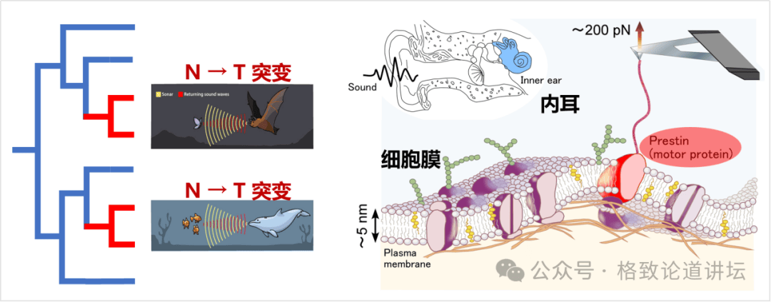 在2010年的时候,我的一位师姐发表了一个研究,她在蝙蝠和齿鲸这两类生物当中,发现了同样的突变。这个突变在这两类生物中是分别独立发生的,所以是基因组层面的趋同演化。非常凑巧的是,这个突变恰好发生在一个叫Prestin的蛋白上,这个蛋白又正好分布在我们内耳的细胞膜上,那么它可能与这个动物的听觉,尤其是对超声波的听觉有非常密切的关系。