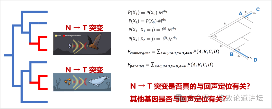 我是做基因组演化计算研究的,我们的工作是通过数学模型的计算,去检测之前发现的这样一些趋同突变跟动物适应环境,是不是有决定性的因果关系。比如说,我的师兄师姐所发现的这个突变,是否真的与蝙蝠和齿鲸为适应昏暗的环境,发展出来的回声定位能力有关系。