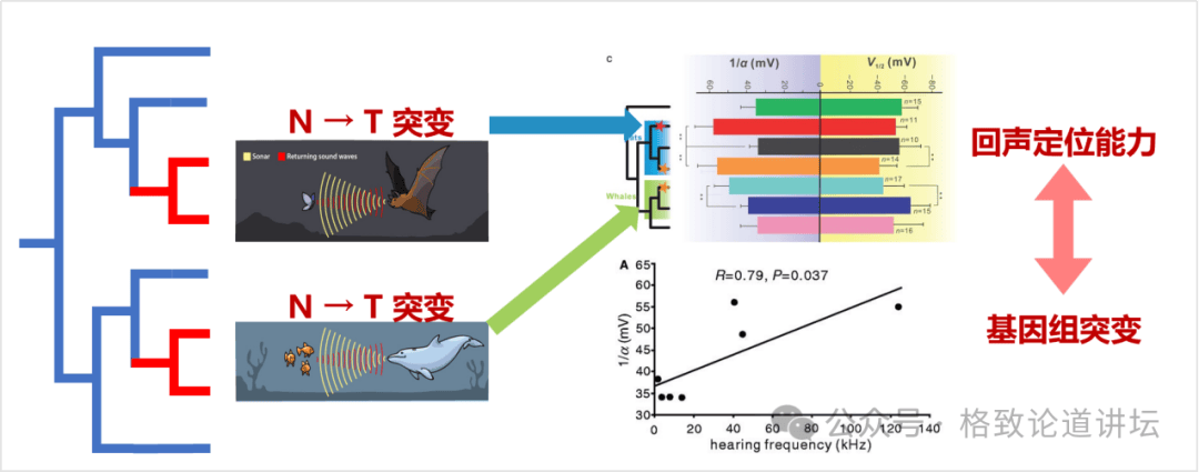 所以,四年之后,我的另外一位师兄又做了一个研究。他用实验的手段直接证明了我们在基因组当中发现的这个突变,确实导致了动物听到频率更高的声音,与回声定位能力是有关系的。