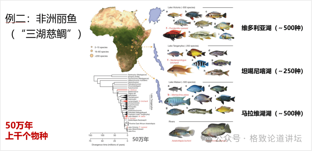 我再举另外一个例子来解释趋异演化,那就是非洲丽鱼。水族爱好者都会非常熟悉,这就是我们所说的“三湖慈鲷”。“三湖”指非洲的三个大湖,在50万年的时间之内,慈鲷的共同祖先就在这三个大湖当中,演化出了上千个物种。