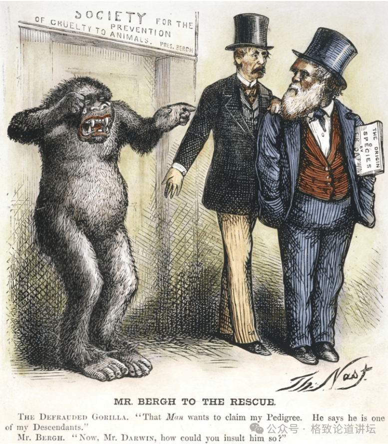 比如这张漫画里,猩猩就指着达尔文说:这个人居然想上我的族谱!由此可见,“人到底是不是猴子变的”一直是大家非常纠结的问题。