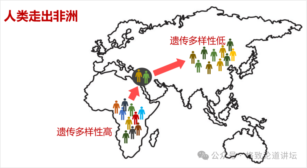 所以今天,如果我们去看世界各地人群的遗传多样性,我们会发现非洲人群的遗传多样性很高,仍然保留多种多样的遗传突变。但是我们世界各地的其他人群,虽然长相多种多样,但是遗传多样性是比较低的,我们保留下来的遗传突变是比较少的。这就是遗传漂变对于人类这个物种的影响。