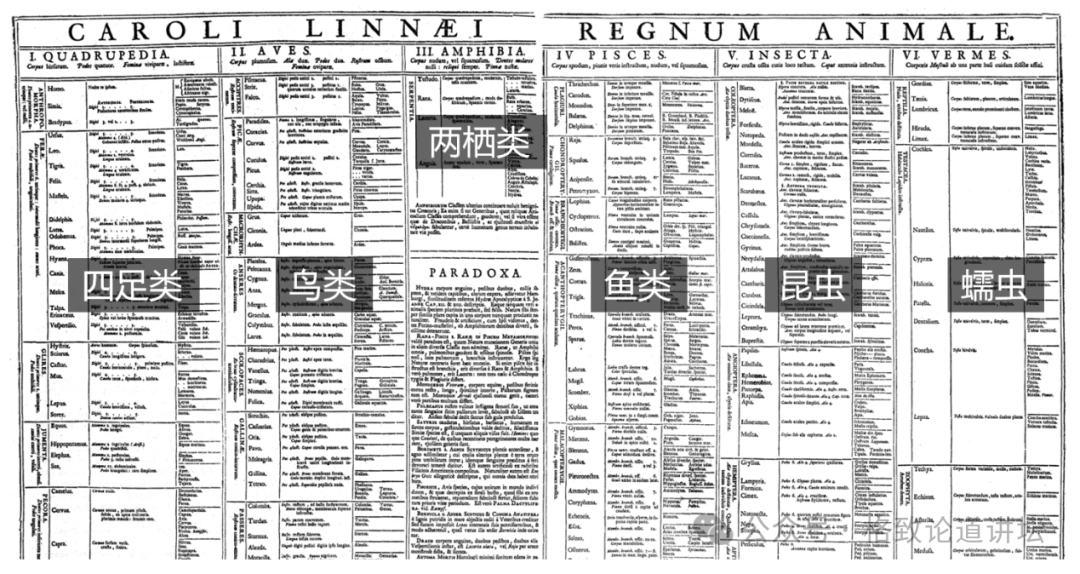大家可以看到,林奈是把物种分类做成一个表。在这个表中,他把动物分成了四足类、鸟类、两栖类和鱼类等等。
