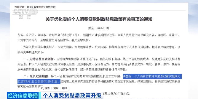 总台央视记者 刘彦霖:此次的新政策,相比去年9月开始实施的个人消费贷款贴息政策,有多方面的优化升级,包括将政策实施期限延长至2026年年底、将信用卡分期业务纳入贴息范围等。这两天,多家银行都已发布公告,将落实政策优化相关服务。