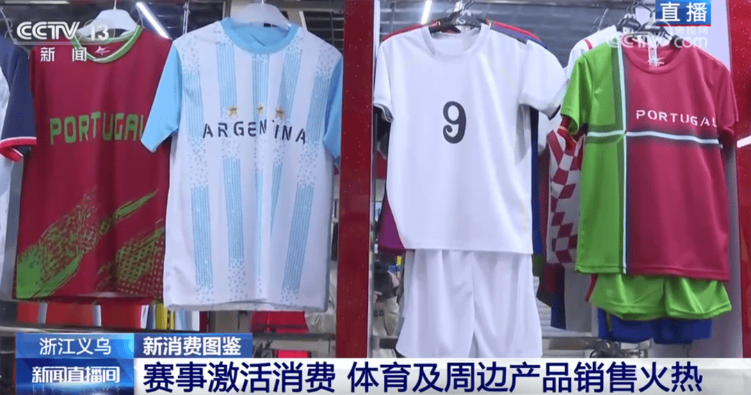 记者现在在义乌国际商贸城三区的体育用品专区,这家商户主营的是足球球迷服,大家还记得四年前的卡塔尔世界杯吗?当时这家店的老板通过观察各个参赛队球迷服的订单走势,特别是赛前那一波波的追单情况,成功预测了阿根廷队会夺冠!您看,体育经济和义乌市场之间就这样有了一次特别巧妙的联动。