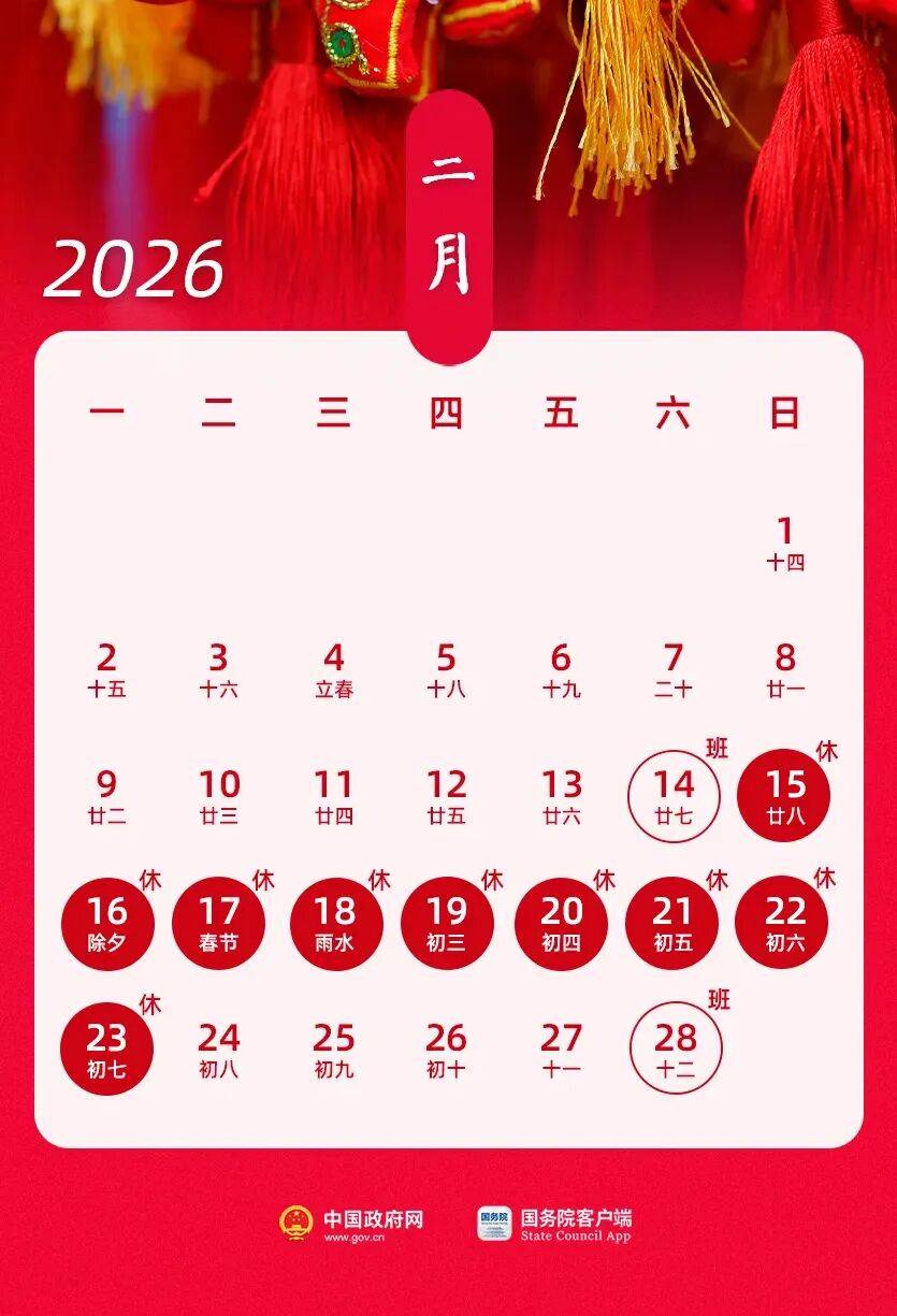 2月15日(农历腊月二十八、周日)至23日(农历正月初七、周一)放假调休,2月14日(周六)、2月28日(周六)上班。