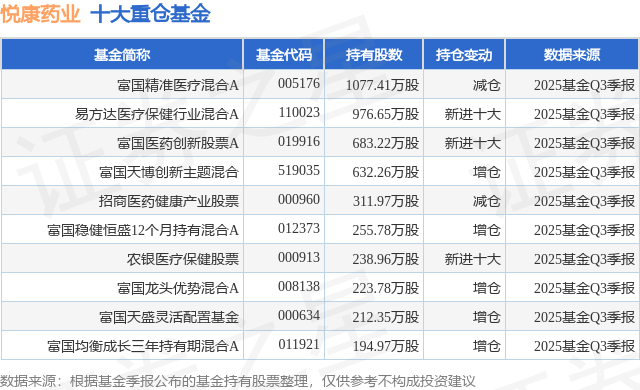 重仓悦康药业的前十大公募基金请见下表: