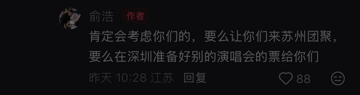 至于其他城市员工能否到苏州总部观看演唱会,红星资本局注意到,相关发文留言区,有自称为深圳员工的网友留言也想看演唱会。对此,俞浩回复称:肯定会考虑你们的,要么让你们来苏州团聚,要么在深圳准备好别的演唱会的票给你们。