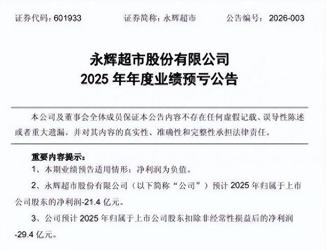 1月20日晚间,永辉超市公告称,预计2025年度归母净利润亏损21.4亿元,上年同期亏损14.7亿元;归属于上市公司股东扣除非经常性损益后的净亏损29.4亿元,上年同期净亏损为24.1亿元。