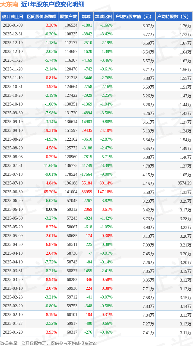 从股价来看,2025年12月31日至2026年1月9日,大东南区间涨幅为3.3%,在此期间股东户数减少1801.0户,减幅为1.66%。