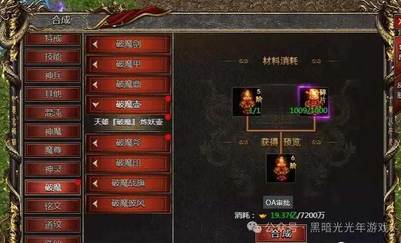 另外,还可以收集对应的破魔装备碎片和万能合成石合成破魔碎片,破魔碎片可以将你打到或用不上的低阶破魔装备分解掉,就能换回对应的碎片,也可以通过一些运营活动获取哟!