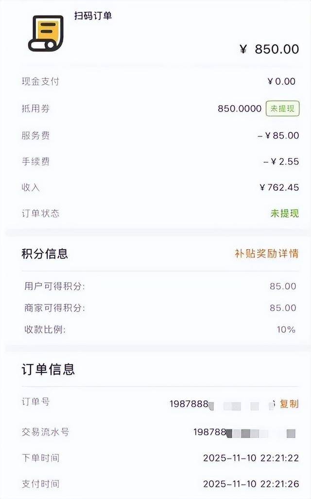 “两个月多了,我的抵用券提现到现在还没有到账。”近日,消费者小艺(化名)向记者表示,2025年11月10日,有消费者通过“我店”平台使用抵用券在其店铺消费850元,扣除服务费、手续费等,小艺可以提现762.45元,然而这笔款至今没有到账。