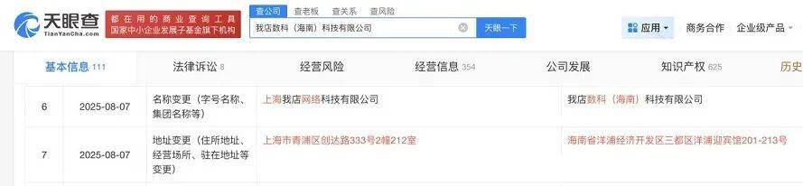 资料显示,“我店”的运营主体原为上海我店网络科技有限公司,原注册于上海,后于2025年8月迁至海南儋州,公司名称也变更为我店数科(海南)科技有限公司。我店方面将此次变更称为品牌升级,称“标志着我店数科发展进入全新阶段”。