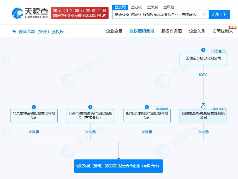 天眼查App显示,近日,爱博弘盛(扬州)股权投资基金合伙企业(有限合伙)成立,执行事务合伙人为国信弘盛私募基金管理有限公司,出资额5亿人民币,经营范围为以私募基金从事股权投资、投资管理、资产管理等活动,由国信证券(002736)旗下国信弘盛私募基金管理有限公司、扬州园创领航产业投资有限公司、北京爱博诺德投资管理有限公司、扬州市生物医药产业投资基金(有限合伙)共同出资。