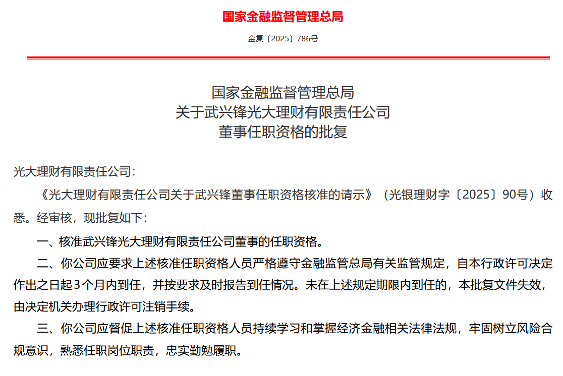 1月26日金融一线消息,国家金融监督管理总局日前发布《关于武兴锋光大理财有限责任公司董事任职资格的批复》,核准武兴锋光大理财有限责任公司董事的任职资格。