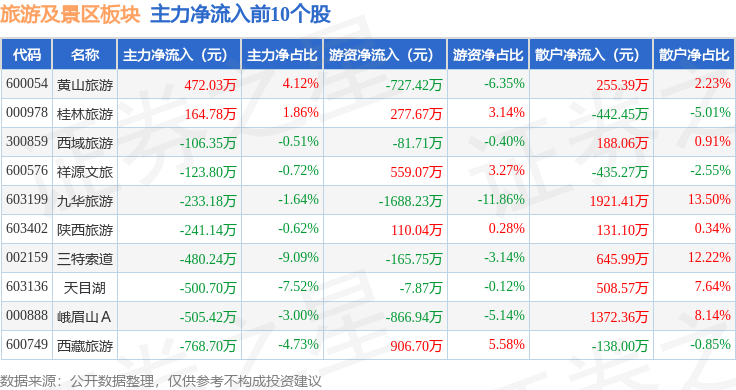 从资金流向上来看,当日旅游及景区板块主力资金净流出5.55亿元,游资资金净流入9343.33万元,散户资金净流入4.62亿元。旅游及景区板块个股资金流向见下表: