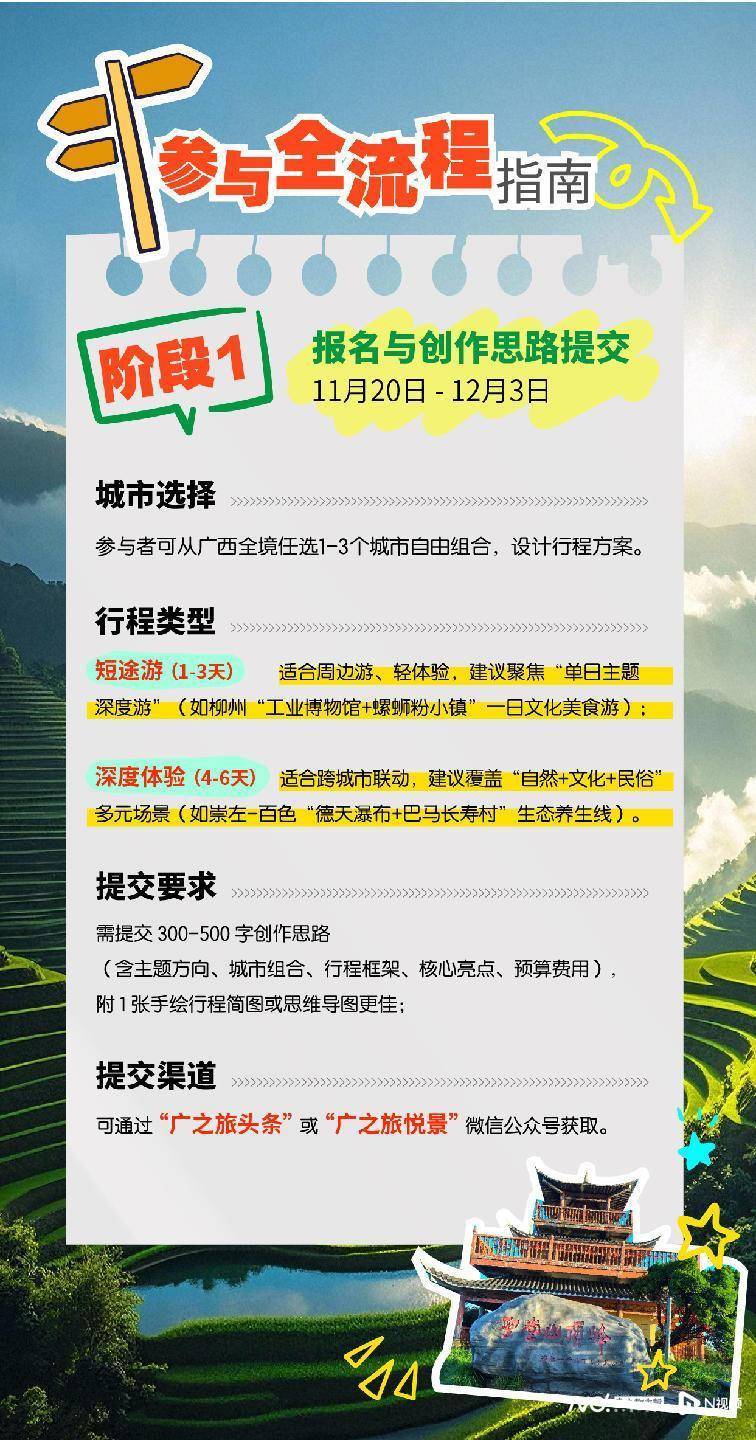参与者可通过“广之旅头条”或“广之旅悦景”微信公众号报名及提交行程方案。主办方将从创意性、可行性、地域特色契合度三大维度评选入围方案,入围者可获专项路书创作基金支持,用于实地体验与内容产出。