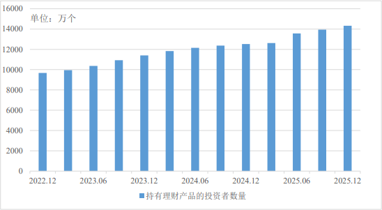 2025年,理财投资者数量维持增长态势。截至2025年末,持有理财产品的投资者数量达1.43亿个,较年初增长14.37%。其中,个人投资者数量较年初新增1769万个,机构投资者数量较年初新增31万个。