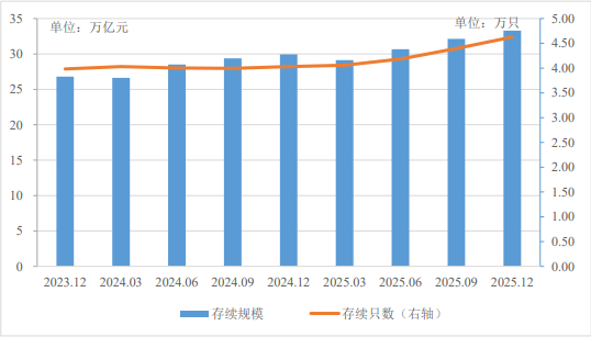 截至2025年末,全国共有159家银行机构和32家理财公司有存续的理财产品,共存续产品4.63万只,较年初增加14.89%;存续规模33.29万亿元,较年初增加11.15%。